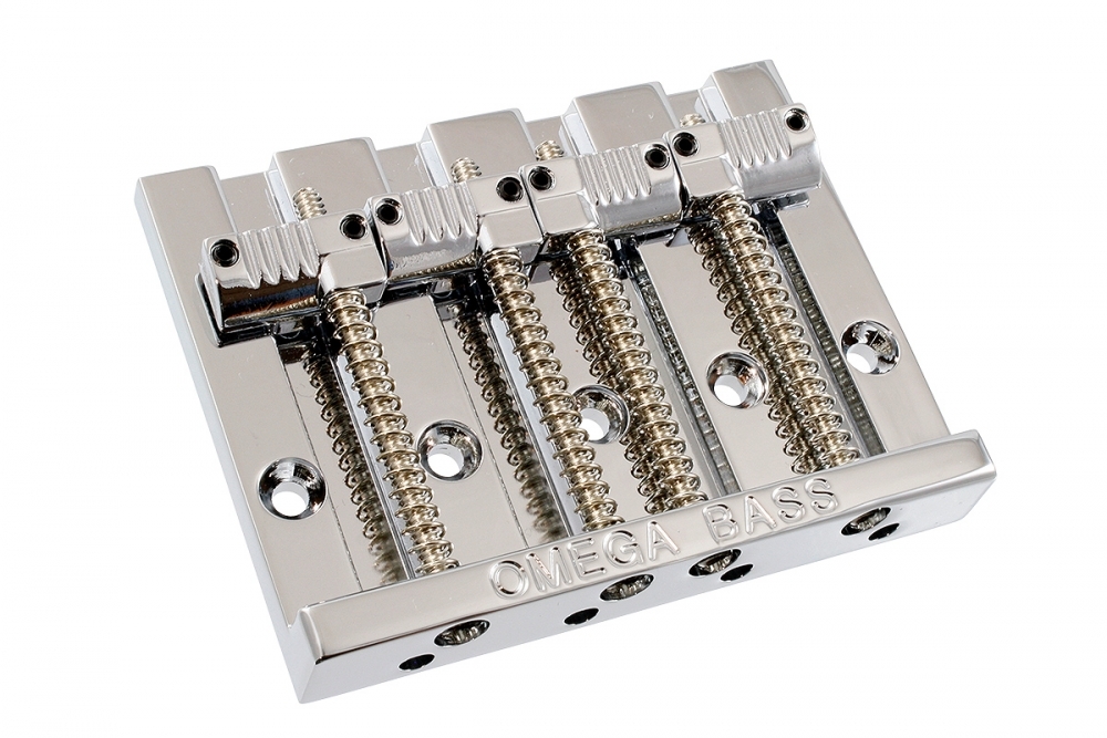 Omega bass guitar bridge with grooved saddles. High density die-cast Zinc with chrome finish. Includes mounting screws. 2.25 inch string spacing. Base footprint 3 7/32" x 2 15/32".