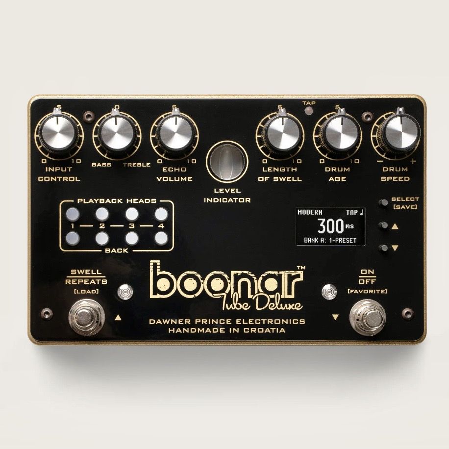 We completely updated a DSP virtual magnetic drum concept and enhanced it with a dual-triode vacuum tube in the signal path and an EM81 Magic Eye tube level indicator, all powered by high plate voltage. Incorporating digital management over each analog parameter of the unit, the Boonar Tube Deluxe now offers effortless adjustment via intuitive onboard controls and a graphical user interface screen. With the addition of presets, an external tap tempo input, remote switching and expression pedal compatibility, along with full MIDI integration, customization is a breeze. Furthermore, we added a balanced and transformer-isolated DI wet output for the seamless integration with studio mixing desks and external recording equipment.