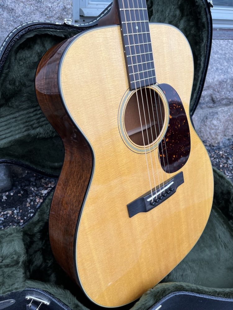 Carrying a distinct vintage-inspired design and updated like the D-18 a few years ago, the redesigned 000-18 offers many of the features found in our pre-war era guitars. The 000-18, which has a beautiful aging toned top in Sitka spruce, is married with genuine mahogany back and sides. The body is edged with tortoise binding and complemented with a polished finish. The 24.9” short scale model’s neck features a modified low oval profile with Performing Artist taper, with a width of 1-3/4” at the nut and 2-3/16” string spacing for easy playability. Nickel open-geared tuners with butterbean knobs are found with a rosewood headplate, which displays a large old style Martin logo.