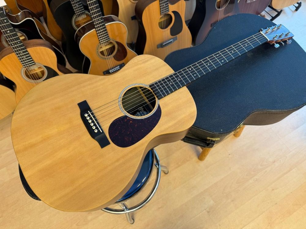 A Grand Performance-14 fret, non-cutaway, acoustic-electric model that features a Sitka spruce top and high-pressure laminate mahogany-grained back and sides. The rust colored laminate neck complements the rich hue of the back and sides, making this an aesthetic beauty. Equipped with Fishman Sonitone electronics with USB for a great dynamic sound.